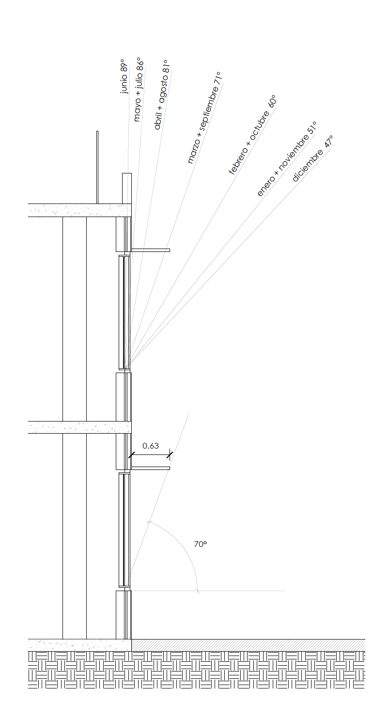 En la figura 8 se observa el cálculo del alero en la parte inferior y el análisis del punto más alto del sol en distintos meses. Como se puede apreciar en el dicho esquema, durante los meses más calientes, que son de marzo a septiembre, el alero no deja que entre el sol en las horas más críticas. Durante los meses más fríos, que son de octubre a febrero, el alero permite la entrada del sol para calentar los espacios.
