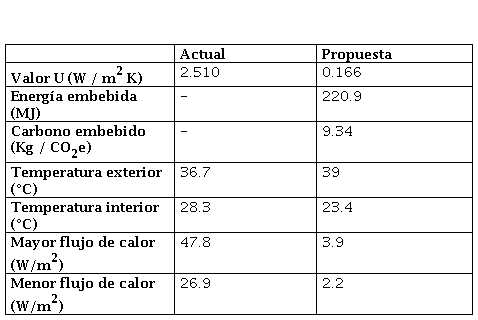 En la propuesta para el muro, baja la temperatura al interior 3 °C en comparación con el muro actual. Sin embargo, el flujo de calor baja considerablemente en la propuesta. Como se puede observar en la tabla 2, el flujo de calor disminuye considerablemente utilizando el aislamiento de polipropileno. Se puede concluir que el muro de la propuesta tiene más capacidad de aislar el calor del exterior, sin necesidad de cambiar la parte externa del muro de la fachada.