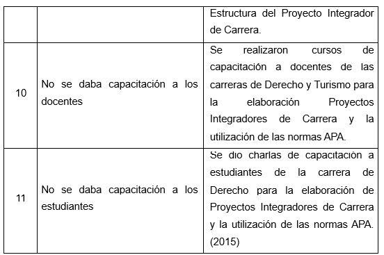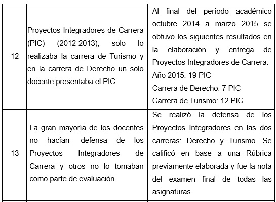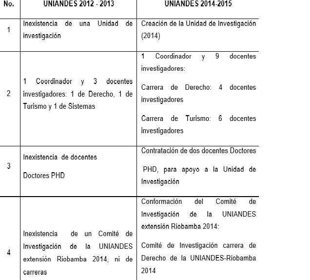 Como se muestra en la tabla 1, se estableció una comparación entre los años 2012-2013 y 2014-2015 en el área de investigación referente a las carreras de Derecho y Turismo de UNIANDES Riobamba, evidenciando los cambios que se han dado en estos últimos años, en cuanto a producción y capacitación científica como: proyectos de investigación, proyectos integradores de carrera, artículos científicos, ponencias internacionales, cursos de capacitación para docentes y estudiantes, entre otras.