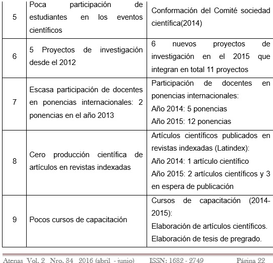 En los dos últimos años se han dado cambios positivos en la actividad científico- investigativa. Los docentes contratados Doctores PHD, de nacionalidad cubana han sido un apoyo fundamental para los cambios practicados en el campo de la investigación. Los cursos de capacitación han contribuido a aumentar el interés de docentes y estudiantes por la actividad científico investigativa.