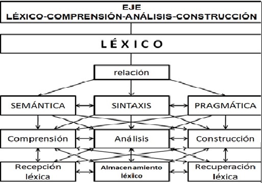 Una didáctica del léxico debería concebir que este componente constituye un eje, que articula los componentes funcionales de la lengua, al que denominamos: eje léxico-comprensión-análisis-construcción (Fig. 1), el cual parte de considerar todos los elementos léxicos como componentes de la dimensión semántica, sintáctica y pragmática (como se observa en la imagen). Desde este punto de vista, el léxico se integra a los restantes niveles organizativos de la lengua y la sintaxis no se reduce a las relaciones entre las palabras. Se incorporan así al análisis del texto, en su dimensión sintáctica, aspectos de la fonología, la lexicología, la morfología y la sintaxis, que resultan pertinentes para explicar la combinatoria de las palabras en los contextos de uso. Además, se fortalecen sistemáticamente, y actuando de manera dialéctica, las etapas de recepción, almacenamiento y recuperación léxicas, que son parte de la competencia lexical.