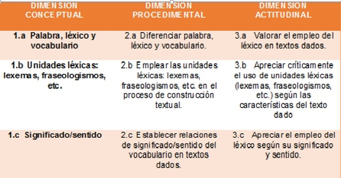 A partir de esta definición de competencia lexical y sus dimensiones, en lo conceptual el estudiante debería poseer conocimientos sobre el léxico, el vocabulario, las unidades léxicas o palabras, fraseologismos, el lenguaje tropológico, relaciones léxico-semánticas, sintácticas y pragmáticas, entre otros saberes. En lo procedimental debería manifestar el dominio de habilidades y capacidades en situaciones conocidas o nuevas con la ayuda del profesor o de forma independiente que le permitan establecer diferencias entre significado y sentido en textos dados, reconocer los elementos que integran las estructuras de las palabras, emplear las palabras en diferentes textos, entre otras capacidades. En lo actitudinal, en situaciones conocidas o nuevas, el estudiante deberá poseer convicciones y valores que le permitan apreciar el empleo del léxico, del lenguaje tropológico, entre otros saberes, según su dependencia a la semántica, a la sintaxis y a la pragmática textuales.