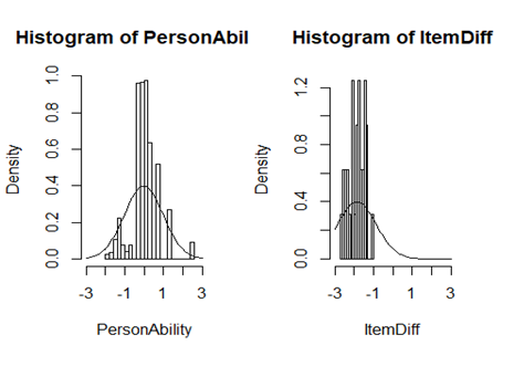 Como puede apreciarse, se ha logrado separar el comportamiento de la habilidad latente de los educandos, en relación con el constructo que está siendo objeto de evaluación (PersonAbility), de los niveles de dificultad de los componentes del instrumento (ItemDiff); se trata de una colección de reactivos de bajo nivel de dificultad pues, a diferencia de la habilidad, sus puntajes en la nueva escala (correspondiente a la TRI) se distribuyen muy a la izquierda de cero (ente -2.7 y -1).