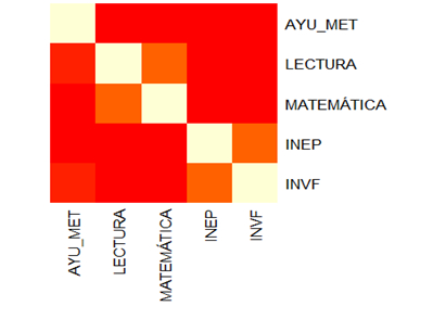 En la representación que sigue se ha indagado sobre los niveles de asociación existentes entre los puntajes de los estudiantes de la muestra en las pruebas de logro de Lectura y Matemática, y los valores añadidos de: un índice del nivel educativo de sus padres (INEP), otro del nivel de vida de su familia (INVF), y uno tercero del nivel de la calidad de la preparación metodológica de los docentes que le imparten clases (AYU_MET), según el criterio del director de la escuela.