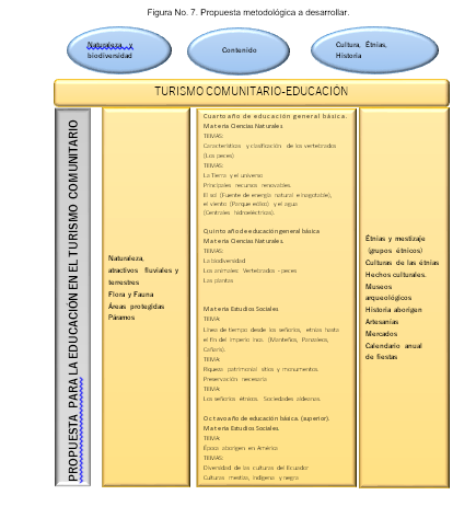 El resultado del trabajo es el empleo de una metodología con enfoque sistémico para la educación de los niños de la Educación General básica de las instituciones educativas del Cantón Santiago de Píllaro. El objetivo es determinar donde resulta factible aplicar experiencias vivenciales a los contenidos que se imparten, con el propósito de formar los valores para fortalecer la identidad y puedan ser transmitidos desde los pequeños grupos hasta el resto de los actores en la comunidad, como parte participativa e integrada en el turismo comunitario donde el estudiante conoce su entorno con base en el turismo comunitario a través de la empresa “El provenir”. Los componentes resultantes de la propuesta se pueden observar en la figura No.3.