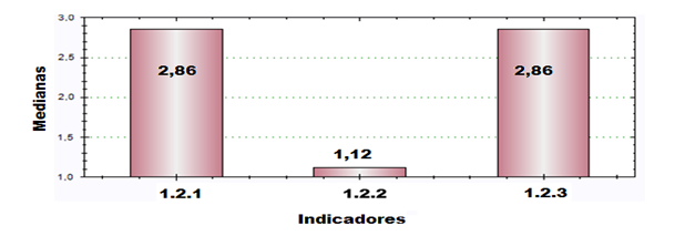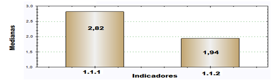 Subdimensión 1.1- Concepción del profesional universitario a formar (1.1). La Figura 1 posibilita apreciar los valores de mediana para los dos indicadores de esta subdimensión.