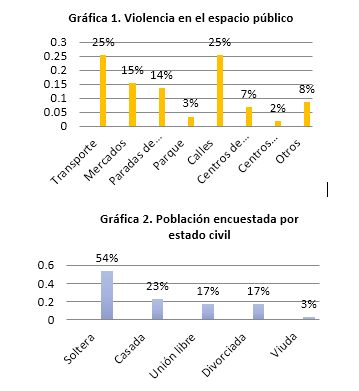 Tanto la observación de los espacios públicos de los diferentes cantones de Portoviejo, así como las encuestas realizadas mostró que la mayoría de los lugares donde se produce la violencia de género están relacionados al transporte público y las calles de las ciudades, estas últimas particularmente las que se ubican en zonas de menor afluencia de personas. También se constató que las mujeres solteras son las que mayor acoso reciben, pues se exponen con mayor frecuencia a espacios de confluencia pública, dígase centros nocturnos, transporte público, así como a las propias universidades.
