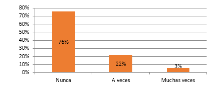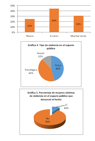 También se obtuvo información acerca de los tipos de violencia y el porcentaje de mujeres que ha sufrido esta situación. Es así que se conoce que la violencia física es la que ocurre con mayor frecuencia, manifestada en asaltos callejeros, empujones en lugares públicos, contacto no deseado entre personas desconocidas, forcejeo y violaciones. Muchas de las mujeres encuestadas manifiestan que no siempre se sienten seguras en las calles, plazas, pues en muchas ocasiones los atacantes se les hacen encima de manera inesperada y en cualquier horario. Esta relación se muestra en las gráficas 3, 4 y 5.