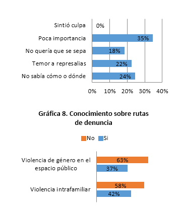 En el caso de la gráfica 7 y 8 se muestra cómo las propias víctimas no acuden a denunciar el hecho aludiendo que no lo hacen por temores a represalias, el desconocimiento del dónde hacerlo y el hecho de que no se convierta del conocimiento público.