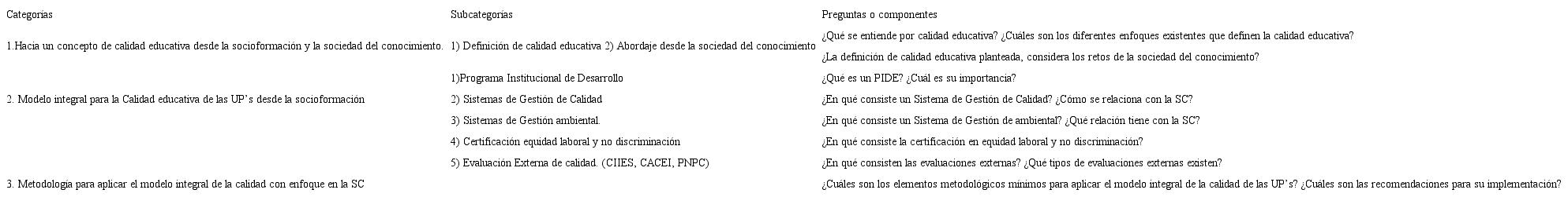 Se realizó un análisis documental en torno al aseguramiento de la calidad educativa en el marco de la sociedad del conocimiento. Específicamente el análisis consistió en buscar y seleccionar documentos relacionados con el tema. Como estrategia de investigación se siguieron algunos ejes de la cartografía conceptual (Noción, caracterización y ejemplificación) (Tobón 2015). Posteriormente se definieron categorías y subcategorías de análisis (Tabla 1), las cuales permitieron orientar la investigación hacia la construcción del modelo integral de calidad de las Universidades Politécnicas en el marco de la sociedad del conocimiento.