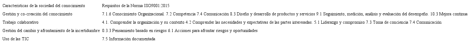En un SGC se identifican los procesos clave, estratégicos y de apoyo que permiten el logro de la Misión y Visión institucionales. La Norma ISO9001:2015 incluye nuevos requisitos que consideran los cambios que la nueva sociedad demanda. En la Tabla 5, se muestran aquellos requisitos, con los que se cubren las características de la sociedad del conocimiento identificadas por Tobón et al., (2015).