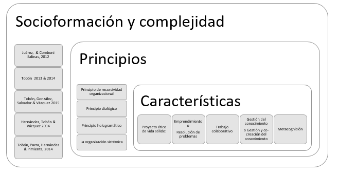 Elaboración propia.Clasificación de la socioformación Las propuestas de Tobón se les ha otorgado validez en diversos estudios relacionados con el ámbito educativo, para una articulación del conocimiento, se clasifica a la socioformación en características propias del enfoque para un constructo metodológico de los ejes que se identifican en la figura 2, y se observan la interrelación de principios del pensamiento complejo de Morin (2002). Citado por (Juárez & Comboni, 2012).