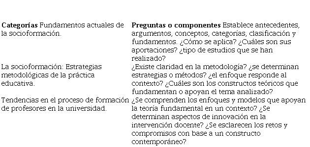 El análisis documental se basa en referentes de tipo cualitativo, se organiza en categorías para facilitar la comprensión del estudio de teorías fundamentales, complementarias en apoyo al desarrollo de los diversos estudios del enfoque de la socioformación, se argumenta la propuesta mediante un análisis crítico de los referentes actuales que permiten describir con profundidad el planteamiento de las metas del estudio aplicado a programas de posgrado como se detalla en la Tabla 1.