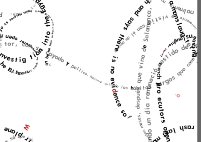 Cuando el texto deviene código es pasible de innumerables operaciones automáticas sobre las cuales Solaas construye su poema, y de las cuales se deriva la lectura de Kozak. La politicidad inherente a la puesta en obra se funda en el carácter referenciable de los textos, que los iguala en el dispositivo. Entiendo que con las líneas que se van entrecruzando, con las letras que migran de un texto a otro, Solaas ofrece una representación crítica de la circulación lingüística en el marco de la globalización, acelerada por las tecnologías digitales. De manera análoga a los flujos migratorios que “en las sociedades globales contemporáneas no son de hecho azarosos, sino que están atravesados por las necesidades del sistema” (Kozak, “Out of bounds” 6). Cabe agregar un aspecto novedoso, para que esa necesidad pueda ser atendida por el dispositivo técnico: para ser procesado, el lenguaje debe ser estandarizado. Un rasgo ominoso del presente de la comunicación digital es la referenciabilización de todo. Tal indexación universal anima el objetivo declarado de Google5. Una crítica política de las poéticas tecnológicas debe necesariamente, entonces, tomar en consideración esta implicancia de la digitalización como fenómeno técnico. Con relación al título del poema y sus connotaciones, el tratamiento de los migrantes en los países desarrollados es considerado como un flujo a ser técnicamente administrado por los sistemas migratorios (y en ese aspecto no es tratado de modo muy diferente al flujo de tráfico automotor, al nivel de polución, o al nivel de agua de una represa). De modo complementario opera el paradigma de seguridad que identifica y particulariza a los sospechosos de terrorismo o de activismo político dentro de los flujos poblacionales, especialmente los migrantes. Se trata de tecnologías en las que la referenciabilización se extiende a los cuerpos que son codificados, lo que permite ejercer sobre los sujetos una agencia automatizada controlada por software (Berti e Iparraguirre 122-126). La estandarización no solo permite fundar poéticas, sino también políticas, de allí lo interesante de la obra de Solaas para repensar el fenómeno que tematiza explícitamente ya desde el título de su poema: las migraciones de sujetos, de lenguas y de técnicas.