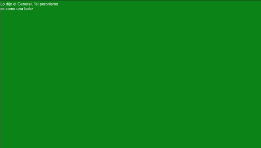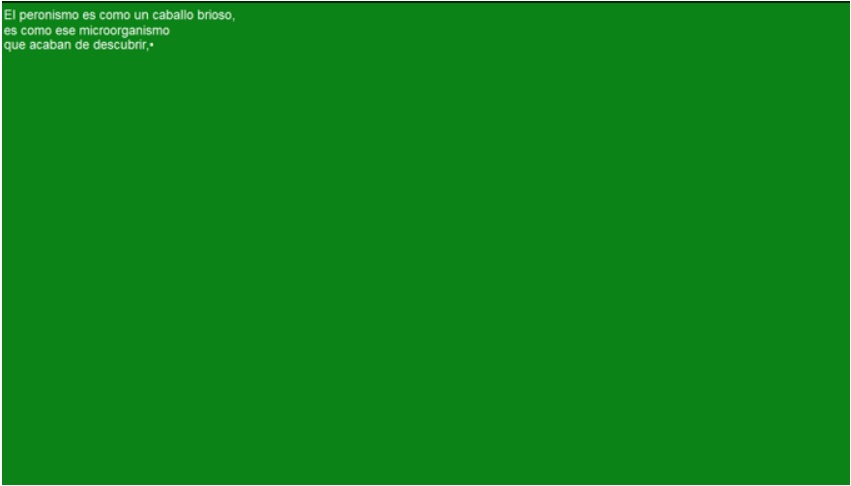“Peronismo (Spam)” de Carlos Gradín es un poema visual que demanda una “percepción en la atención”, ya que impone al lector una velocidad que impide el detenimiento y la relectura, disponibilidades características del libro como tecnología. Es una suerte de reversión de la conocida noción “percepción en la distracción” que propiciaba la proyección cinematográfica de acuerdo a Walter Benjamin (51-55), solo que en este caso el lector no se puede dar el lujo de abandonarse al flujo de las imágenes. La existencia de la obra literaria como flujo temporal, lo que genera este modo particular de recepción, es un rasgo que aparece en otras obras de poesía digital incluso desde antes de la masificación de Internet (Berti 144-146). Al estar programado mediante Time Based Text, el poema de Gradín tiene una fuerte impronta rítmica reforzada por la música electrónica que acompaña el poema. El poema es una animación que presenta en pantalla el tipeo y el borrado de versos generados desde los resultados de Google para cadena de caracteres “el peronismo es como”: “Es como la literatura de César Aira, / es una esponja que chupa todo, / es el aleph de la Patria, / es como es, / como nosotros / ¿El peronismo es como el pasado nazi en Alemania o el comunismo en Europa del Este? / Es como un chicle, el sarampión, una camisa”. En relación al procedimiento compositivo, Gradín señala: