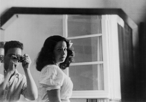 Factor decisivo en el engranaje poético, la visualidad atraviesa la escritura de Berenguer tanto en el nivel “temático” como en el “técnico” (De los Ríos). Hemos destacado que, en los poemas examinados, el espejo, el ojo-cámara y la fotografía funcionan como tres “mediadores semióticos” —en términos de Liliane Louvel— que introducen variaciones icónicas en el discurso verbal (Louvel 11). El léxico y las isotopías asociadas a la luz, la mirada y el movimiento refuerzan la analogía con las tecnologías de la imagen, por lo cual los poemas devienen en complejos artefactos capaces de enfrentar a los/as lectores-espectadores/as con las condiciones materiales que rodean y posibilitan la representación, así como con sus límites, impuestos por la niebla, el humo, el fantasma o la sombra. Los juegos con la iluminación, el encuadre y el punto de vista recuerdan, por otra parte, a algunos experimentos fotográficos que realizó José Pedro Díaz, esposo de Amanda Berenguer. Concretamente, pensamos en un retrato donde se puede ver a la poeta joven en posición central, frente al espejo, en el instante en que su marido, junto a ella, dispara la foto (Figura 3)9.