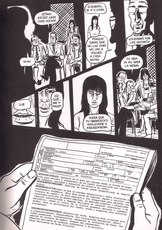 Su silencio es apropiado por los médicos que ensayan diagnósticos y medicaciones. Un equívoco provocado por la suposición de un psiquiatra de que “oye voces” deriva en un diagnóstico erróneo que el lector ya puede intuir en la insistencia en negarlo de la mente de la protagonista. La transcripción del documento médico en letra imprenta crea un espacio de verosimilitud en un texto que, pese a ser protagonizado por un alter ego y que, como se explica en un epílogo, modifica la vivencia de su autora para acelerar el final de la historia, se presenta en el subtítulo como “una historia real” (escribe Montse Batalla: “‘Gracias a experimentar la segunda psicosis cicloide pude cambiar el final de Manicomio”. Su retrato dibujado en el paratexto se parece significativamente a la Clara protagonista). Siguiendo con el diagnóstico, la primera vez que logra negarlo ante una junta de médicos, la respuesta de los profesionales la llevará a un callejón sin salida: “Porque digas que no las oyes no vas a volver a casa antes” (87). La resolución del equívoco solo será posible desde el momento en que Clara puede revisar las imprecisiones de su diagnóstico y afirmar ante un nuevo psiquiatra que nunca ha oído voces. La voz de la que aparentemente debíamos desconfiar —la de la persona que desvaría, que no sabe lo que le pasa, que no puede expresarse— deviene finalmente como voz honesta. Se interrumpe así la condición heterológica del discurso que identifican Dolmage y Jacobs en relación con los cómics sobre discapacidades: “the disability needs to be ‘ablesplained’ by a medical authority —and these explanations often usurp the voice on perspective of the narrative and overwrite their identity in scientific and pathological terms” (“Mutable” 17).