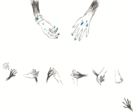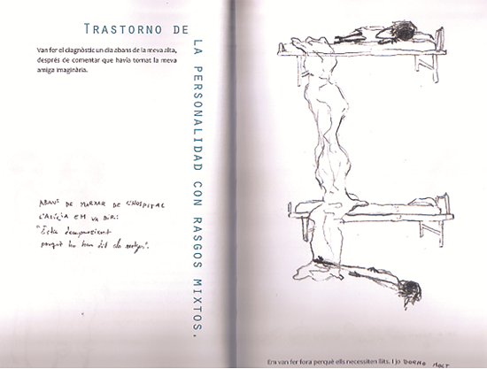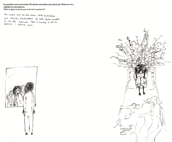 Aquí se ven sus voces internas que se escapan gráficamente de su cabeza cuando no puede dormir. Sus manos, sin embargo, aparecen dibujadas dibujando, cosa que refuerza el pacto de realidad de todo el volumen, también reafirmado en las localizaciones interiores y exteriores del Hospital del Mar de Barcelona, cuya imagen institucional en azul se estampa en las sábanas. En este azul que en algunas páginas contrasta con el negro omnipresente se encuentran también dibujadas pequeñas heridas en las manos que no se mencionan en el texto, generando en el lector la impresión de no saberlo todo, de no tener, de hecho, derecho a saberlo todo. En azul aparece, asimismo, la amiga imaginaria, Alicia, que se presenta cuando Maria está peor y que acelerará su diagnóstico. Sin embargo, ni el color ni la metarrepresentación del dibujo y la escritura ni las localizaciones ni el pacto claramente autobiográfico sirven para establecer unas bases de realidad que ajusten la fiabilidad del relato. Porque en realidad, esta fiabilidad no importa y, por esto, no se resuelve. Lo que cuenta y lo que se cuenta es el proceso en el que la narradora vive una situación de internamiento, conecta con otros pacientes y genera visiones y explicaciones sobre su propia situación. Es, de hecho, este relato poco resolutivo el que le ha servido a su autora, Maria Manonelles, para transitar por múltiples escenarios donde se reflexiona sobre la salud mental.