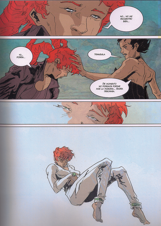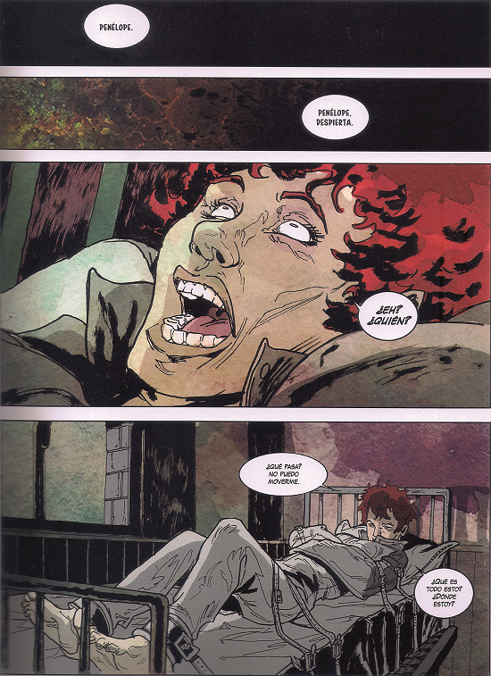A simple vista, Penélope seguramente parecería una obra por completo diferente a las dos comentadas. Su estética corresponde a la del cómic de género fantástico. De hecho, es ese el marco genérico donde parece resolverse el conflicto de la protagonista, una Penélope cuyo viaje no es, como el de Ulises, exterior, sino una odisea interior hacia un lugar de cordura que la aleje del “mundo de los proyectos hundidos”, un universo dominado por Deseo, el controlador de las fobia. Tampoco hay aquí un narrador que guíe textualmente y, de hecho, al contrario que en Manicomio, la focalización no es solo interna, sino que se ven también escenas que ocurren al margen de la mirada de la protagonista. No hay aquí, de nuevo, una frontera clara entre la percepción lúcida y la que entra en el plano de la alucinación. Ya el principio del relato nos introduce en un sueño de Penélope, que, al despertar de la pesadilla, sigue viendo en su habitación al guardián que la conducirá entre el mundo “real” y el “fantástico”. Como en Manicomio, la mirada desorbitada de la protagonista en un primer plano abrirá la puerta a la alucinación.