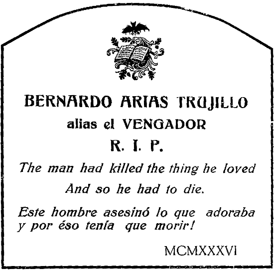 Ambos traductores se insultaron innumerables veces, pero Valencia da un inesperado paso más y en la penúltima página de El vengador de Wilde visualiza la lápida de Arias Trujillo sellada con la inscripción wildeana “The man had killed the thing he loved / And so he had to die” (74). Justo antes de la imagen, irónicamente dice: “para memoria de este crimen y ejemplo en lo porvenir, se colocará una lápida en la fosa del ajusticiado, con esta leyenda en inglés y correspondiente traducción del convicto” (74):