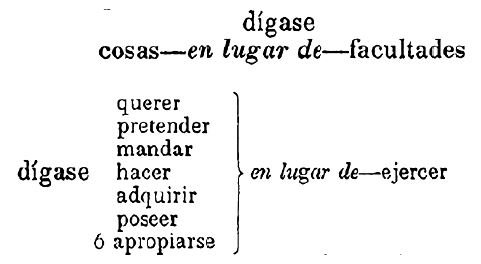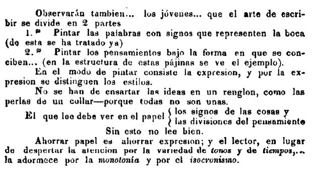 Es preciso también recordar que, con anticipación a las propuestas anotadas, se dio a conocer a finales del siglo xix el diagrama de Peirce, esquema que puede asociarse también con el trabajo de Rodríguez. Este diagrama, creado por el lógico y matemático Charles Sanders Peirce (1839-1914), se constituye como imagen de las estructuras mentales. El plano incluye un cuadrado dentro de un círculo que, cruzados ambos por el centro, vertical y horizontalmente, dividen el espacio en cuatro cuadrantes que se identifican con los estados mentales. Lo significativo para este caso es que el diagrama y las partes que lo componen son más importantes que las palabras. Lo que hace Peirce es introducir símbolos con funciones diversas para sugerir relaciones distintas entre los elementos. Estos símbolos podrían relacionarse con el uso de corchetes, puntos, comillas, símbolos de operaciones matemáticas y guiones o líneas en Rodríguez para evitar la repetición, agrupar, ordenar o separar las partes. Estas herramientas evitan, pues, el uso de palabras de las que puede prescindirse y aportan en la construcción del sentido. Se incluyen aquí algunos ejemplos en los que se destaca la agrupación de palabras centradas o alineadas a derecha o izquierda, unidas al uso de puntos suspensivos o de guiones que superan la medida correcta de su uso (en cuanto a la corrección gramatical) (figuras 5, 6, 7 y 8). No importa aquí lo correcto, como conjunto de normas que orientan la escritura de una lengua determinada, para que el mensaje sea comprendido por el lector, sino lo preciso o lo adecuado, de acuerdo con los objetivos de quien escribe. En este caso, lo incorrecto puede orientar mejor. Violar la norma será, entonces, intencional y se deriva de aquel programa latinoamericano del que hacen parte Andrés Bello, Domingo Faustino Sarmiento, Juan García del Río y otros intelectuales interesados en la creación de nuevas normas para el español de la América Libre.
