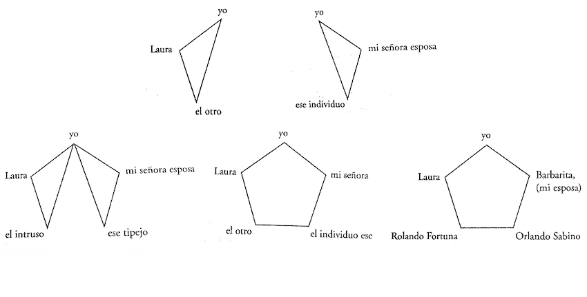 La introducción de la novela explica el título y anticipa al lector el argumento. Santiago, el protagonista, se enamora de Laura, pero no se atreve a acercarse y se siente rechazado por ella. Para paliar su dolor, imagina un triángulo amoroso (yo-Laura-el otro) que tiene su eco en el triángulo de su vida real, compuesto por él mismo, su esposa y el amante de esta (yo-Bárbara-el otro). A partir de esto, él mismo une los puntos convergentes para formar una nueva forma geométrica, la del pentágono. Para ilustración de los lectores, la introducción incluye los gráficos sucesivos de composición de la figura: