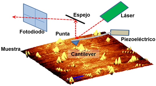 El funcionamiento básico del AFM, por sus siglas en inglés (Binnig, Quate y Gerber, 1986), consiste en una interacción entre todas sus partes, entre ellas están: un foto-detector (4 cuadrantes), un voladizo o cantiléver con una punta, los posicionadores de materiales piezoeléctricos, el láser y la muestra (Aguiar, Loria y Salazar, 2017). Su funcionamiento corresponde a una pequeña punta de un par de micras de largo sujeta a una viga en voladizo (cantilever); esta realiza un barrido sobre la superficie de la muestra a ser evaluada, de forma que va tomando los datos para determinar las características topográficas y de fases del (Olmos, 2009). Con esa configuración, el voladizo detecta las fuerzas de interacción que se generan entre la punta y la superficie de la muestra; es decir, las fuerzas de van der Waals, electrostáticas y repulsiones electrónicas que surgen en distancias nanométricas (Roa, Oncins, Díaz, Sanz y Segarra, 2011). Además, el AFM usa un sistema de deflexión láser desarrollado por Meyer y Amer en 1988. El láser es reflejado por la parte posterior de la viga en voladizo a un detector de posicionamiento que está compuesto por un fotodiodo de cuatro cuadrantes. De forma que el desplazamiento de la viga resulta en una diferencia en la señal recolectada entre los fotodiodos superior, inferior, el de la derecha y el de la izquierda; y esta se traduce a una deflexión proporcional de la viga (Carrión, Valbuena y Gomez, 2010). Por tanto, se da una retroalimentación debida a la diferencia de señal relativa entre el fotodiodo por medio del control de un software; esto logra que la punta pueda trabajar manteniendo la altura o fuerza constante (Figura 1).