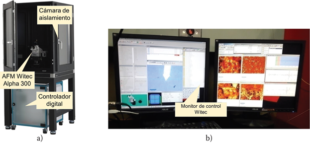 El sistema del AFM permite desarrollar un perfil en tres dimensiones de la superficie tal como se muestra en la Figura 1, lo que resulta en un ensayo de topografía. Además, este se encuentra soportado en una mesa anti-vibratoria y dentro de una cámara diseñada para minimizar la interacción del entorno (García, 2017). En la Figura 2 se muestra como ejemplo el equipo Witec que se encuentra en el Laboratorio Nacional de Materiales y Modelos Estructurales de la Universidad de Costa Rica (LanammeUCR). Para el almacenamiento de la medición completa y el post-procesamiento de datos se utiliza un software específico llamado Witec Control. Este programa cuenta con varios parámetros de aplicación que están en dependencia del tipo de material, modo en que se desea medir y la respuesta mecánica que se desea obtener.