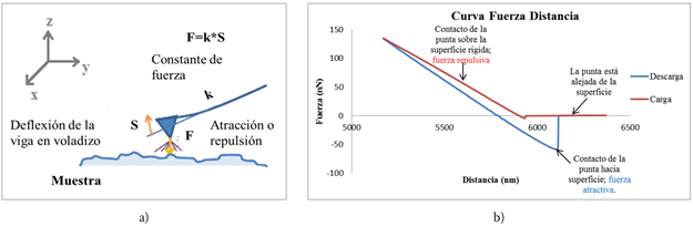 El modo de contacto (CM, del inglés contact mode), funciona mediante el intercambio de la punta que se encuentra al final del voladizo con una pequeña constante de resorte (k); esta es inferior que la constante de resorte efectiva que sustenta los átomos de la muestra. La deflexión del voladizo (S) se produce por la fuerza de contacto, ya que la punta recorre la superficie de la muestra, adaptándose a su topografía y señalando zonas con diversos comportamientos mecánicos. La fuerza (F) en la punta es repulsiva con un valor medio de 10-9 N por ello, la relación fuerza entre la punta y la muestra debe ser constante (Haugstad, 2012). En la Figura 3 se muestra la interacción punta muestra y la obtención de curva fuerza distancia. La importancia de esta última se basa la generación de fuerzas atractivas y repulsivas que se generan al entrar en contacto con la superficie y al alejarse de la misma (carga y descarga), obteniendo de esta la acción de la fuerza que se genera versus el desplazamiento.