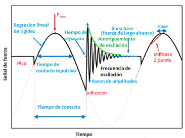 La Figura 4 muestra la señal de modulación sinusoidal que se obtiene el modo de contacto intermitente, en el cual se obtiene una señal de fuerza vs el tiempo, cuando la muestra entra en contacto con la punta se da el pico de adhesión máximo, luego este registra una regresión de rigidez lineal hasta llegar a una fuerza máxima (Fmax) esto en un rango de tiempo repulsivo donde se da una separación entre la punta y la muestra, lo que permite un proceso oscilatorio a una razón de frecuencia, terminado este último se vuelve a repetir la modulación sinusoidal bajo la integración punta muestra (García, 2017). La curva fuerza distancia (Ver Figura 3b) obtenida en el modo de contacto es posible correlacionarla con el modo intermitente para determinar la fuerza máxima que se ejerce sobre la muestra en un rango de oscilación especifico.