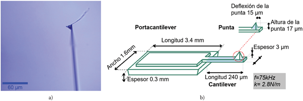 Las puntas que se emplean en el AFM son elaboradas empleando la microfabricación, donde las puntas se producen con radios de curvatura en el rango de 1 nm a 10 nm. La longitud del cantilever puede variar entre 50 micras y varios centenares de micras, y este valor dicta su dureza final o su constante de fuerza del cantilever (k). La punta se elige según la aplicación o la superficie que se desee estudiar, ya que la geometría, dimensiones de la punta y la longitud del cantilever se pueden combinar de muchas formas. El cantilever puede ser de diferentes formas, por ejemplo: triangular y rectangular. En la Figura 5, en la parte a, se muestra un ejemplo de ello.