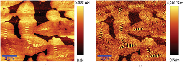 Existen algunas propiedades a nivel micro que se pueden determinar la respuesta microestructural del asfalto utilizando la técnica de Microscopía de Fuerza Atómica. De acuerdo con García (2018), algunas de ellas son: penetración, fuerza máxima, adhesividad, rigidez y respuesta viscoelástica (Ver Figura 6). Asimismo, esta técnica presenta otra ventaja, la cual es que caracteriza los procesos de envejecimiento del material. Este envejecimiento se ve a su vez compuesto por procesos como: la oxidación, la pérdida de componentes volátiles y la exudación; que resultan ser irreversibles en el asfalto. Además, la Microscopía de Fuerza Atómica, permite caracterizar las cuatro principales fases del asfalto, las cuales son: catana-fase, peri-fase, para-fase y sal-fase; con lo anterior al comprender los cambios microscópicos del asfalto se pueden predecir los cambios a nivel macroscópico de este.