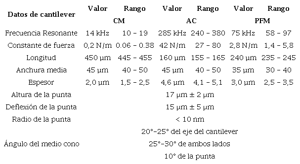 Existe una gran variedad de puntas disponibles en el mercado con diversas constantes de fuerza, frecuencias de resonancia, recubrimientos superficiales, longitud de la punta, espesor y forma. En la Tabla 1 se detallan las características simétricas de las puntas y del cantilever que se utilizan en LanammeUCR para el estudio de materiales, las cuales van en función de su modo de operación. La utilización del tipo de punta y el modo de operación para analizar las muestras asfálticas está en dependencia de las propiedades mecánicas que se desean obtener.