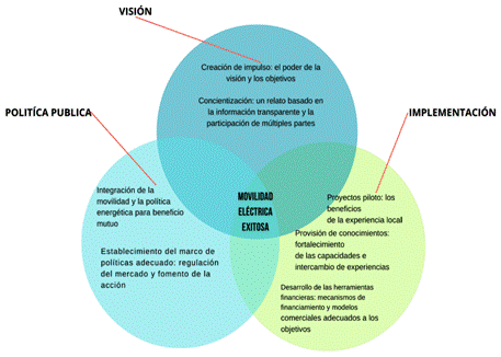 La movilidad eléctrica sostenible debe ser considerada un pilar y un reto importante para los gobiernos. La electrificación del sector nunca ha sido más prominente y relevante en el debate en curso sobre el futuro de la movilidad. Dado que el sector del transporte es responsable de más de una cuarta parte de las emisiones de GEI relacionadas con el uso de combustibles fósiles (Sustainable Mobility for All, 2021), los Estados deben velar por la mitigación de sus emisiones, tal como lo expresa la Contribución Nacional Determinada, NDC (MINAE, 2020). Costa Rica está comprometida a promover el bienestar de todas las personas y de la naturaleza con el fin de tomar acciones alineadas con una meta global de limitar el aumento de la temperatura media mundial a 1,5 °C. De esta forma, la política pública en pro del desarrollo de la electrificación del sector transporte público modalidad bus se ve permeada por la elaboración de las políticas bajo campos de visión (creación y concientización), política pública (marco de políticas) e implementación (acción, desarrollo y evaluación) (Figura 1).
