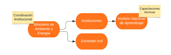 Asimismo, en los artículos 6 y 7 de la mencionada ley, se establece que el MINAE es el actor institucional encargado de coordinar con las instituciones de la administración pública y con los actores no institucionales de la sociedad civil. Asimismo, el Instituto Nacional de Aprendizaje (INA) se estipula como el encargado de brindar las capacitaciones técnicas para generar recurso humano capaz de procesar pertinentemente la tecnología de transporte eléctrico. Véase el siguiente esquema de la Figura 2 para comprender adecuadamente estas relaciones.