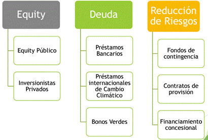 Respecto al primer grupo, los incentivos fiscales creados mediante políticas públicas son una oportunidad que ofrece ventajas atractivas para invertir en el desarrollo empresarial de buses eléctricos. El segundo grupo, sobre las oportunidades de financiamiento, tiene distintas formas para cumplir el objetivo. El proyecto "Transporte", realizado por GIZ, crea tres categorías en donde especifica las posibles fuentes de financiamiento para el transporte público eléctrico. La primera categoría es llamada Equity, la cual consiste en inversiones, ya sean públicas o privadas, cuyo proveedor tenga interés en el desarrollo e implementación de estas tecnologías verdes. La segunda es categorizada como deuda y se refiere a la adquisición de préstamos bancarios, préstamos internacionales de cambio climático y el acceso a bonos verdes. La tercera categoría es sobre la reducción de riesgos, cuya especificación gira en torno a los fondos de contingencia, contratos de provisión y financiamiento concesional. La anterior información se puede ver de mejor forma en el siguiente esquema de la Figura 3.
