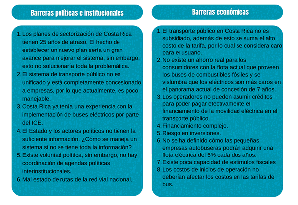 Según lo mencionado por parte de Kruse, respecto a las barreras institucionales, se debe recordar que el sistema de transporte público y la movilidad eléctrica está regulado por parte del Estado de Costa Rica, sin embargo, para ofrecer los servicios se concesiona un permiso a operadores privados (autobuseros).