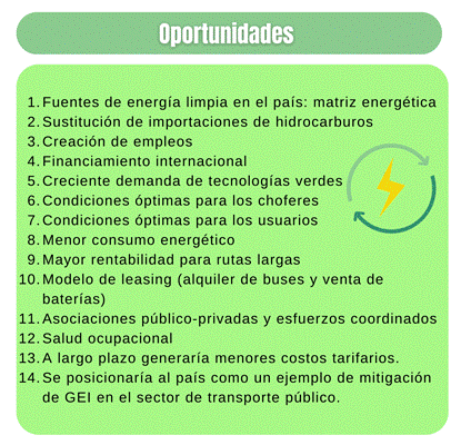 Respecto a las oportunidades analizadas mediante las entrevistas y la revisión documental, es posible ver evidencia que fundamenta la posibilidad de profundizar en las acciones para incluir flota eléctrica en el transporte público del país, tanto desde la capacidad del Estado para abrir mesas de negociación con el sector transportista, como desde el interés de las empresas en mejorar el servicio de transporte público para reducir costos a largo plazo.