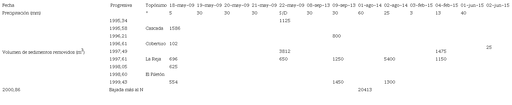 La EICAM tiene registros de datos de precipitaciones del Servicio Meteorológico Nacional (SMN) correspondientes a las estaciones de El Bolsón y Bariloche. En el Cuadro 1 se indican los datos de precipitación en mm registrados en Bariloche y los volúmenes de detritos removidos en los distintos sitios a lo largo de la traza.