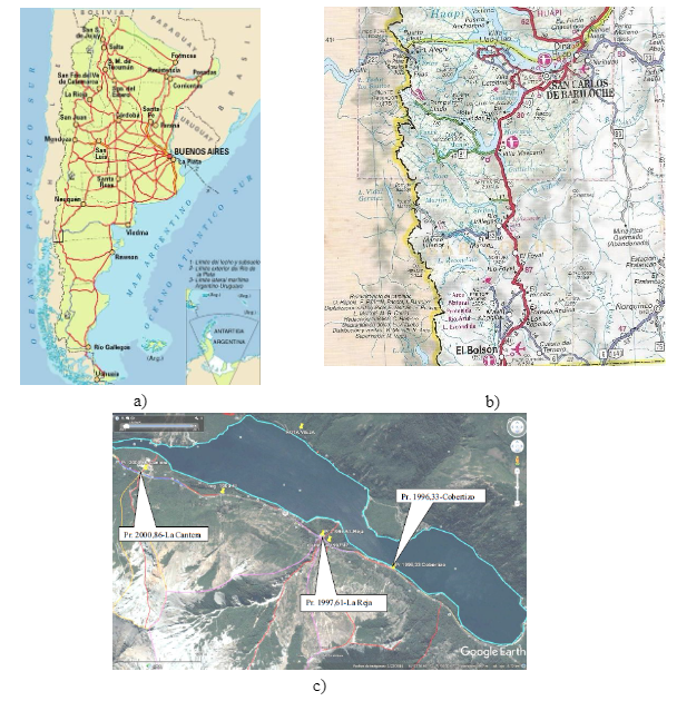 La Ruta Nacional (RN) 40 es la más extensa de Argentina y se extiende de Norte a Sur al pie de la Cordillera de los Andes a lo largo de más de 5000 km, uniendo diez provincias (Figura 1.a). El tramo bajo estudio se sitúa entre las ciudades de San Carlos de Bariloche y El Bolsón en el sector que bordea al lago Guillelmo (Figura 1.b). En agosto de 2016, el 20º Distrito Río Negro de Vialidad Nacional le solicita a la Escuela de Ingeniería de Caminos de Montaña (EICAM), asistencia para solucionar los reiterados cortes que tenían lugar en ese sector de aproximadamente 5 km de longitud (Figura 1.c).