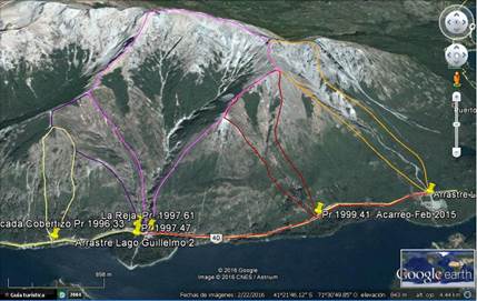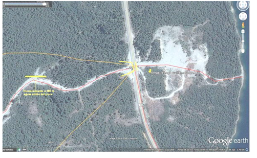 Progresiva km 2000,86. Arroyo “La Cantera”: El primer evento que la afecta tuvo lugar en febrero de 2015, donde se generó una avalancha de material grueso, lodo y troncos que bloqueó la ruta. Se observa una lengua de sedimentos de casi 500 m hacia el lago Guillelmo (Figura 6). Se tiene una alcantarilla de caño corrugado totalmente obstruida por este alud.