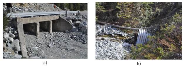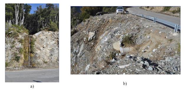 Progresiva km 1996,33 “El Cobertizo”: En este lugar se observa una cascada de 9 m de altura que cae verticalmente. El corte es artificial y fue realizado cuando se construyó el camino (Figura 3.a). La cuenca tiene un área reducida (0,3 km2) y presenta una alcantarilla metálica de hierro corrugado que desagua al lago Guillelmo. Su muro frontal está muy deteriorado (Figura 3.b). El terraplén es muy empinado (1v:1h). En este sector se vienen observando problemas desde 2002 y el último evento tuvo lugar en junio de 2015.