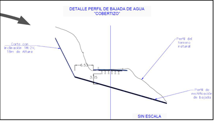 Se prevé construir un salto disipador de energía a unos 50 m aguas arriba del puente, el cual podrá ser vertical si hay roca competente (Chanson y Felder, 2010). Si la roca no es competente, se harán dos saltos de menor altura, o en su defecto un umbral de hormigón o muros de gaviones de gravedad (Maccaferri, 1981) (Figura 9 y Figura 10).