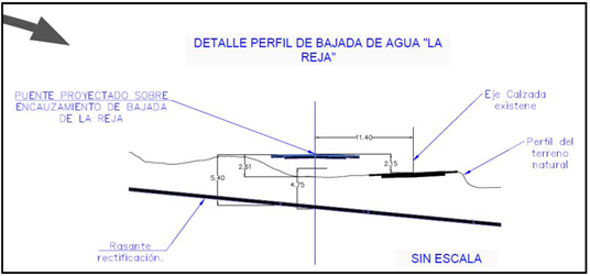 Se propone la construcción de un puente de 30 m de luz. Se desplaza la traza del actual camino hacia aguas abajo para lograr un mayor despeje entre el fondo del tablero y cauce. Se prevé la excavación de canal en el lecho del arroyo. La profundización del cauce es menos importante que en La Reja. No habrá incremento de pendientes longitudinales en los accesos al puente. Se prevé la construcción de espaldones de encauzamiento de caudales, aguas arriba del puente (Figura 11 y Figura 12).