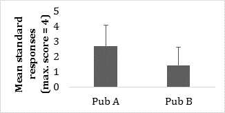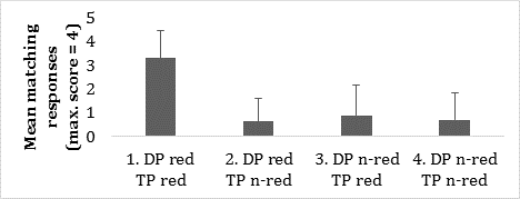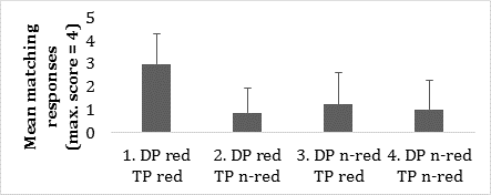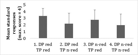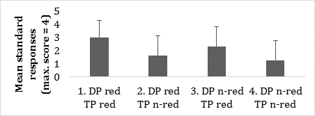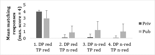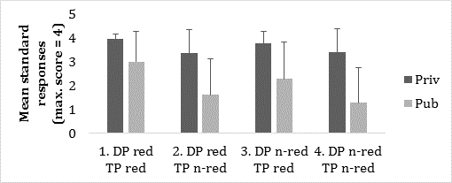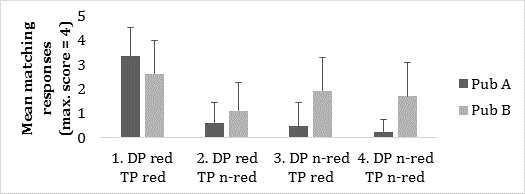 Overall, the results show that the standard condition (DP red/ TP red) is the most reproduced one in both groups. However, Pub B reproduces non-standard forms more often than Pub A.