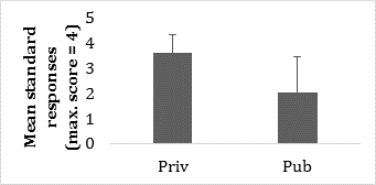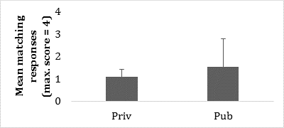 Altogether, the results of matching responses show that both groups preferred the standard variety. However, they differed in the production of non-standard forms: Pub exhibits higher means for non-standard conditions than Priv.