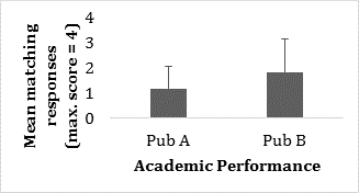 A main effect of Academic Performance was also attested (F (1,50) = 17,877; p < .0001; Pub A: M = 2,69, SD = 1,4; Pub B: M = 1,44, SD = 1,2):