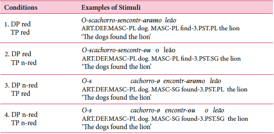 The variation in number agreement in BP is substantially mapped by sociolinguistic investigations, both within the nominal domain and in subject-verb agreement (Brandão, 2011, 2015, 2016; Naro, 1981; Naro & Scherre, 2015; Scherre, 1978, 1991, 1994; Scherre & Naro, 1998, 2006; Vieira & Brandão, 2014). These studies have consistently shown that socioeconomic status (SES) and, consequently, level of education affect the production of plural number agreement in BP, being the standard variety produced by highly educated speakers. Reconciling a psycholinguistic approach with sociolinguistic findings may, therefore, enhance our understanding on how variable input is represented and processed. In particular, the possibility of a sort of bilingual condition is considered, given formal instruction and the progressive contact with written BP at school.