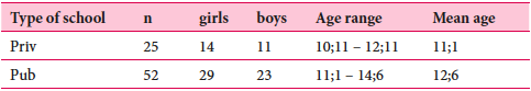 The participants were seventy-seven 6th graders from a private and a public school in Rio de Janeiro grouped according to the type of school they attended: a) Priv (private school - middle-high SES/educational level) and b) Pub (public school- middle-low SES/educational level). The groups were arranged as follows: