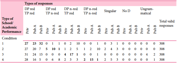 In general, standard responses are most frequently provided in condition 1 (DP red/ TP red), which is the standard variety, and in condition 3 (DP n-red/ TP red), in which the verb is in the plural form. Overall, these results show that academic performance during schooling years enhances the production of the standard variety and that the form of the verb in the input has an impact on the activation of the morphophonological form of agreement.